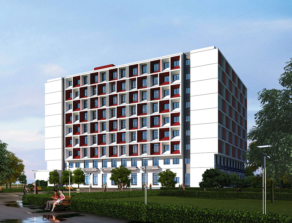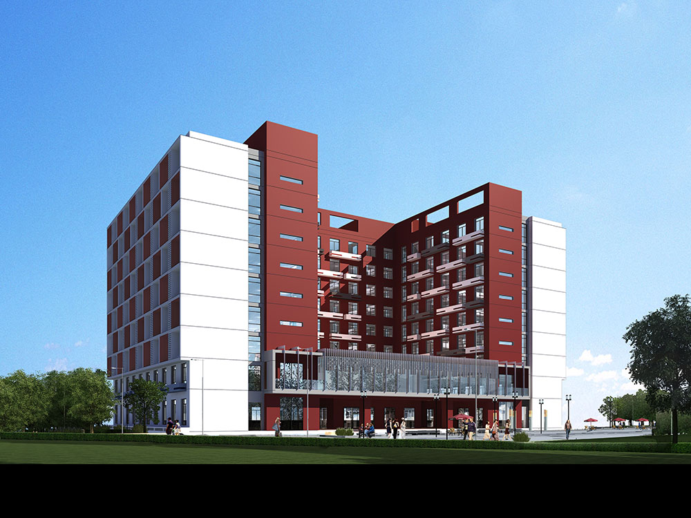 6号学生公寓位于图书馆西侧,建筑面积21119平方米,其中地上面积13600平方米,地上9层地下2层。楼内除安排学生住宿外还设置了咖啡厅学习室、学生活动室、地下车库等功能,更好的丰富学生的宿舍生活。